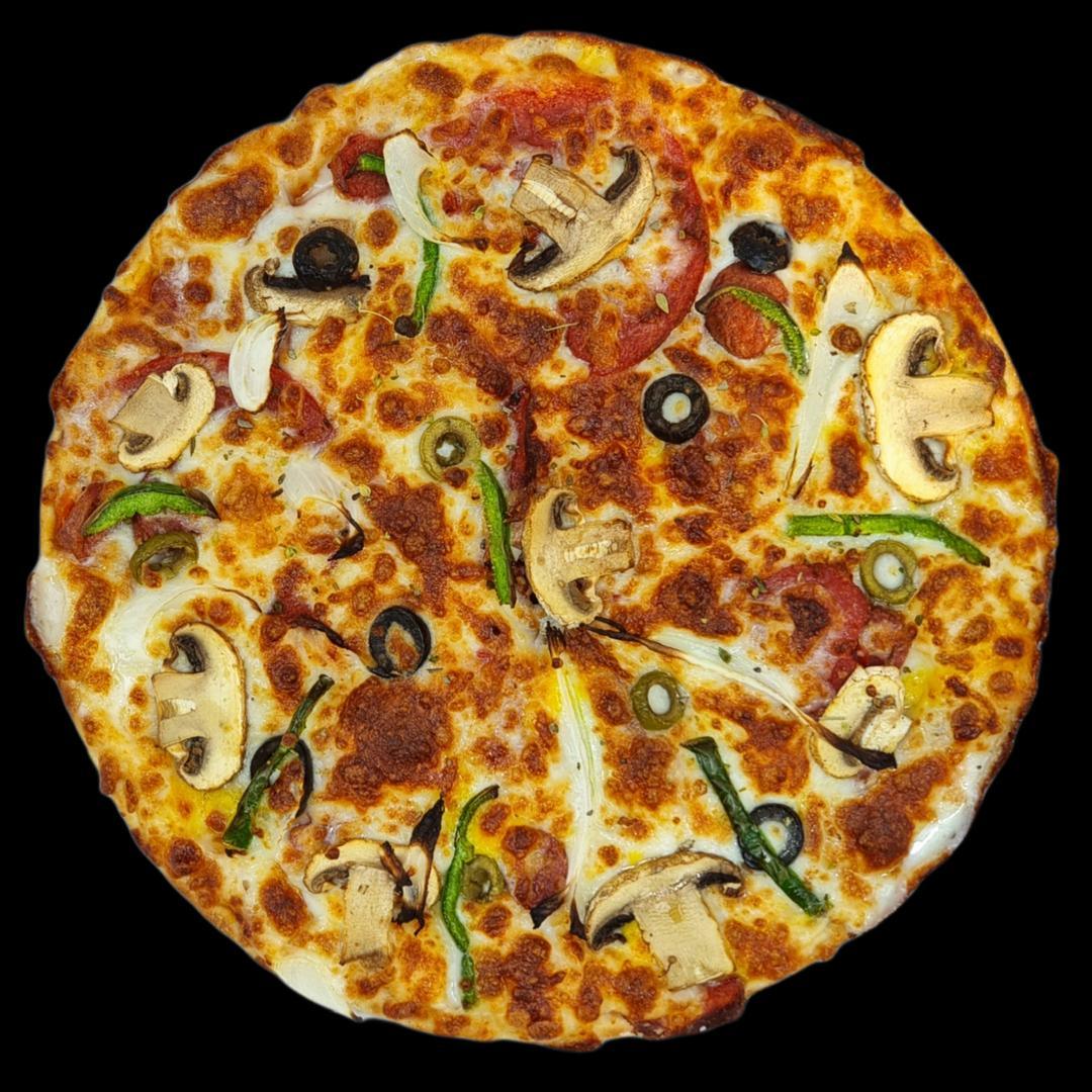 پیتزا مخصوصراسته گوساله مزه دار شده،سینه مرغ مزه دار شده،پپرونی،ژامبون گوشت،فلفل دلمه ای، زیتون، قارچ، پیاز،سس مارینارا، پنیر پیتزاLarge:590T